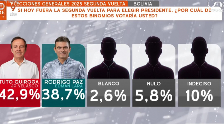 Tuto va primero en preferencia electoral para el balotaje, según encuesta de Red Uno A ocho días de la segunda vuelta electoral, el candidato presidencial de la alianza Libre, Jorge Tuto Quiroga, va primero en preferencia electoral con 42,9%, según una encuesta de la Red Uno. Rodrigo Paz está segundo, con el 38.7%