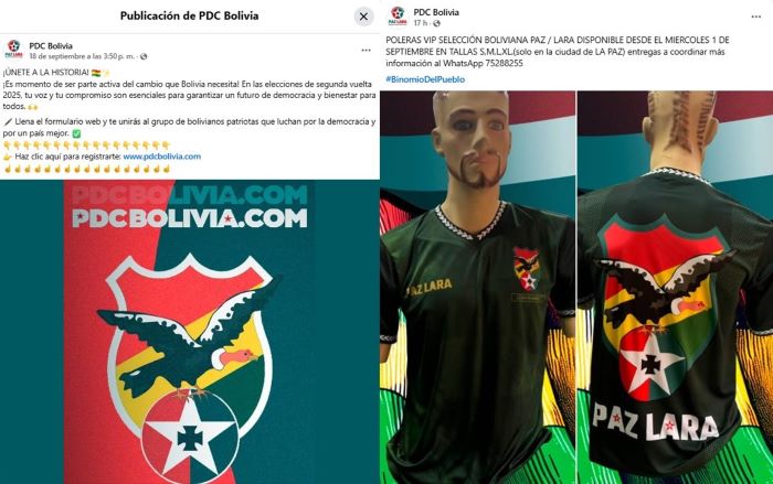 En su cuenta oficial en las redes sociales, el PDC ofrece “poleras VIP selección boliviana Paz/Lara, disponible desde el miércoles 1 de septiembre en tallas S,M,L,XL.(solo en la ciudad de La Paz) entregas a coordinar (…)”.