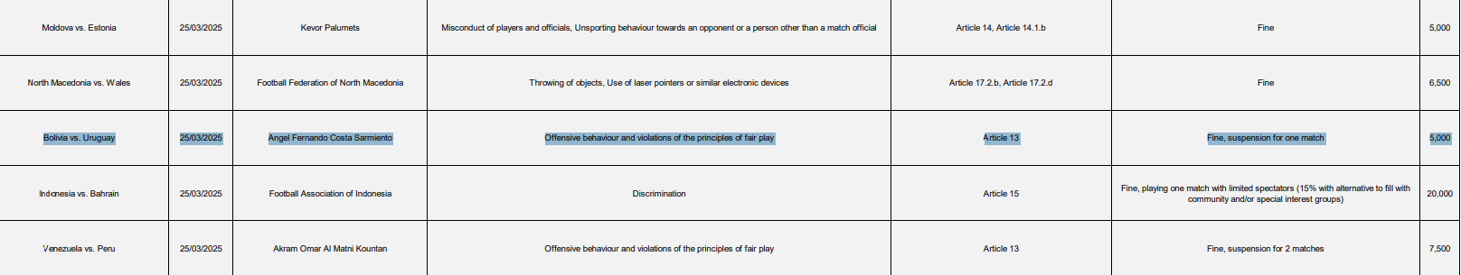 En ese listado figura Costa Sarmiento. De acuerdo con el documento, el presidente de la Federación Boliviana de Fútbol fue multado con 5.000 francos suizos (unos 6.300 dólares) y la suspensión de un partido.