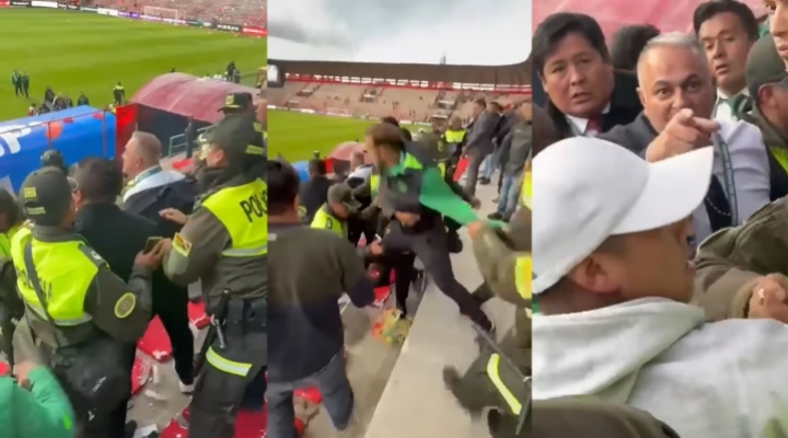 Ambos, alterados y furiosos, discutieron e intercambiaron golpes con hinchas, mientras efectivos de la Policía Nacional intentaban separarlos y calmar los ánimos.