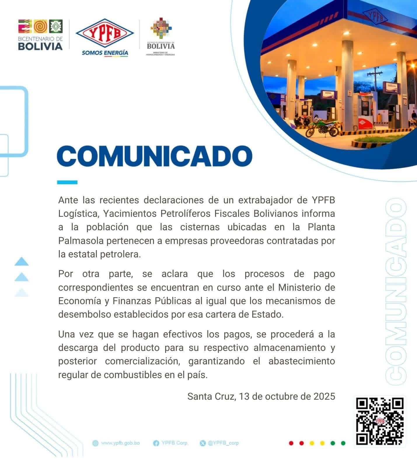 Yacimientos Petrolíferos Fiscales Bolivianos (YPFB) informó que, por falta de pago, los camiones cisterna no pueden descargar combustible en la refinería de Palmasola, en Santa Cruz.