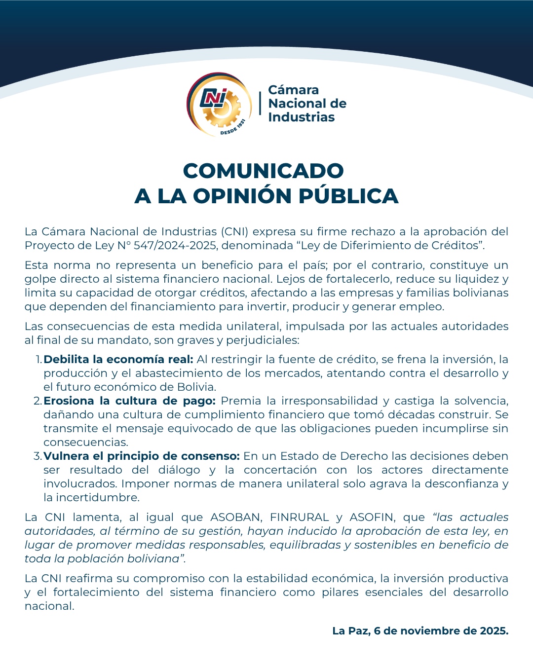 A través de un comunicado, la CNI advirtió que la norma constituye “un golpe directo al sistema financiero nacional”, pues reduce su liquidez y limita su capacidad de otorgar créditos a empresas y familias bolivianas.