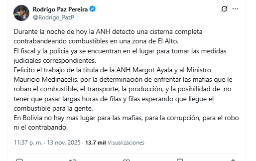 El presidente del Estado, Rodrigo Paz, informó la noche del miércoles que un operativo liderado por la Agencia Nacional de Hidrocarburos (ANH) permitió detectar a un camión cisterna que contrabandeaba combustible en El Alto.