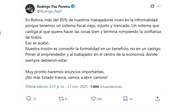 “En Bolivia, más del 85% de nuestros trabajadores viven en la informalidad porque tenemos un sistema fiscal viejo, injusto y trancado. Un sistema que castiga al que quiere hacer las cosas bien y termina rompiendo la confianza de todos. Eso se acabó (…) Muy pronto haremos anuncios importantes. ¡No más Estado tranca, vamos a abrir camino!”, escribió este domingo en su cuenta de X.