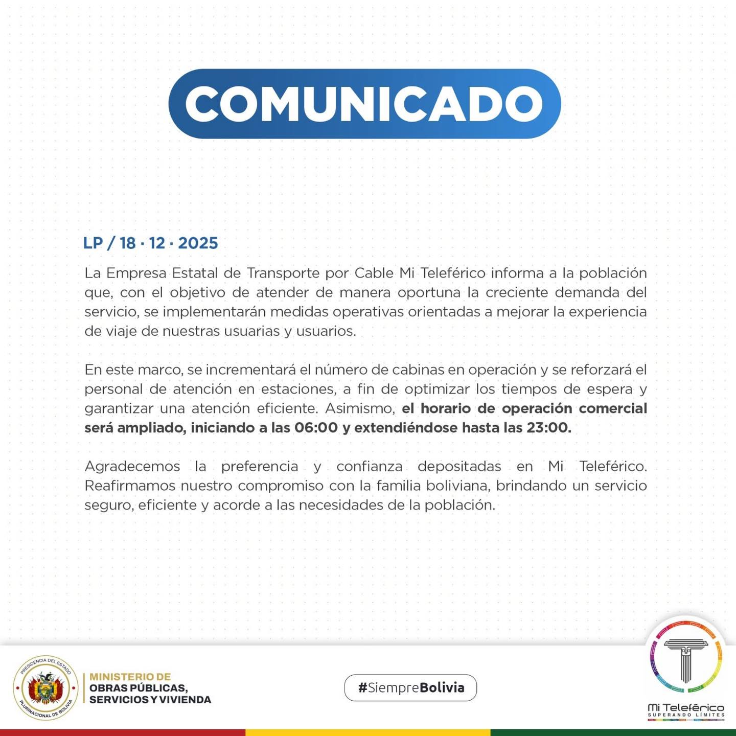 “El servicio ha empezado desde las 06:00. Mi Teleférico está ampliando el servicio media hora antes y cerrando media hora después. En ese sentido se han incrementado la cantidad de cabinas para prestar un mejor servicio a la población”, informó el gerente Ejecutivo de Mi Teleférico, Christian Rojas, a Btv.