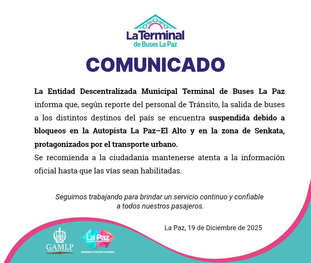 “La Entidad Descentralizada Municipal Terminal de Buses La Paz informa que, según reporte del personal de Tránsito, la salida de buses a los distintos destinos del país se encuentra suspendida debido a bloqueos en la Autopista La Paz-El Alto y en la zona de Senkata”, señala un comunicado de la entidad.