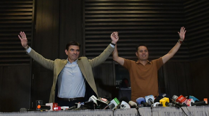 Rodrigo Paz y Edmand Lara saludan en una conferencia realizada el lunes pasado en La Paz. Foto: APG
