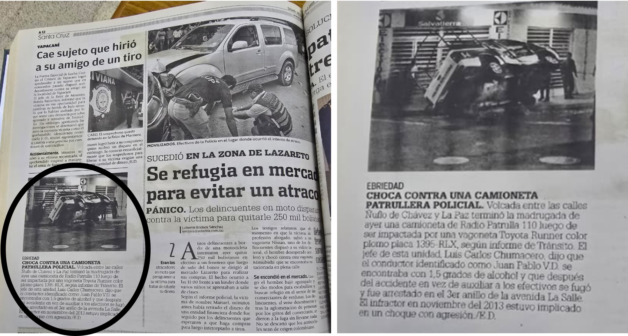 El 26 de febrero de 2015, un hombre identificado como Juan Pablo Velasco provocó el vuelco de una camioneta policial luego de chocar contra ella en estado de ebriedad, en inmediaciones de las calles La Paz y Ñuflo de Chávez, dice una noticia de El Día de Santa Cruz. Se puede leer la noticia aquí.