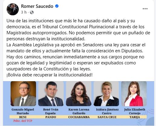 Saucedo, electo magistrado en las elecciones judiciales de 2024, calificó la actuación de los miembros del TCP como una de las más perjudiciales para el Estado. “Una de las instituciones que más daño le ha causado al país y a su democracia es el Tribunal Constitucional Plurinacional, a través de los magistrados autoprorrogados. No podemos permitir que un puñado de personas destruyan la institucionalidad”, advirtió.