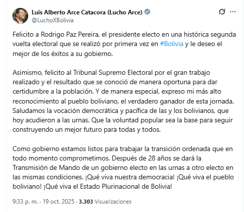 “Felicito a Rodrigo Paz Pereira, el presidente electo en una histórica segunda vuelta electoral que se realizó por primera vez en #Bolivia y le deseo el mejor de los éxitos a su gobierno”, escribió Arce en su cuenta de X.