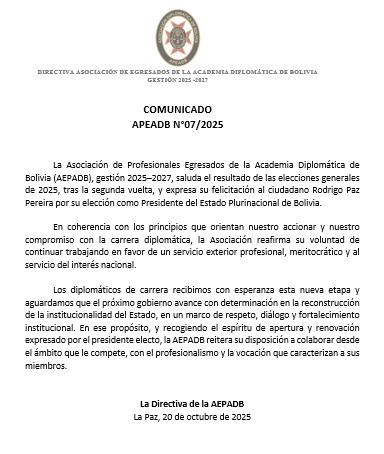 La Asociación de Profesionales Egresados de la Academia Diplomática de Bolivia felicitó al presidente electo, Rodrigo Paz, por su triunfo en la segunda vuelta electoral y consideró que se abre una nueva etapa en la que el Gobierno deberá trabajar en la reconstrucción de la institucionalidad del Estado.