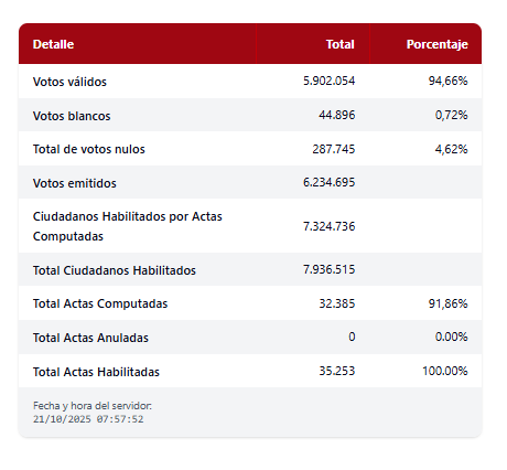 La tarde del lunes finalizó también el conteo en el exterior, donde el PDC obtuvo el 58,76% de los votos y Libre, el 41,24%.