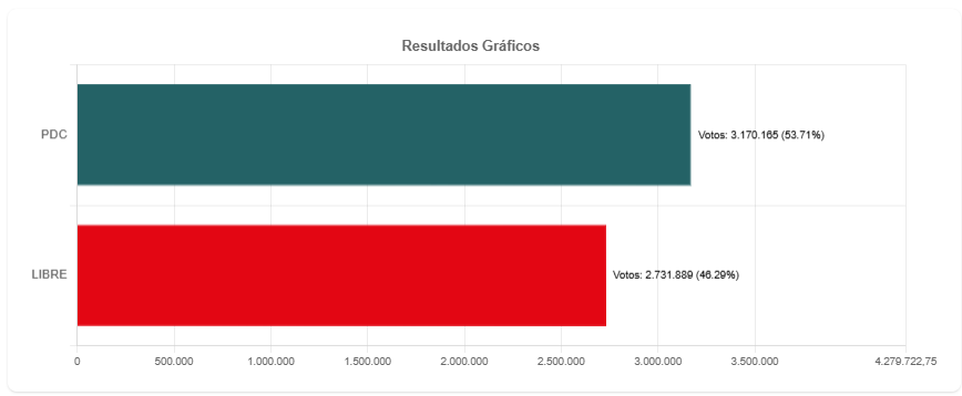 El Sistema de Consolidación Oficial de Resultados de Cómputo alcanzó un 91,86% de avance, con el Partido Demócrata Cristiano (PDC) a la cabeza con el 51,71%, seguido por la alianza Libre con el 46,29%. En cinco departamentos el proceso ya concluyó.