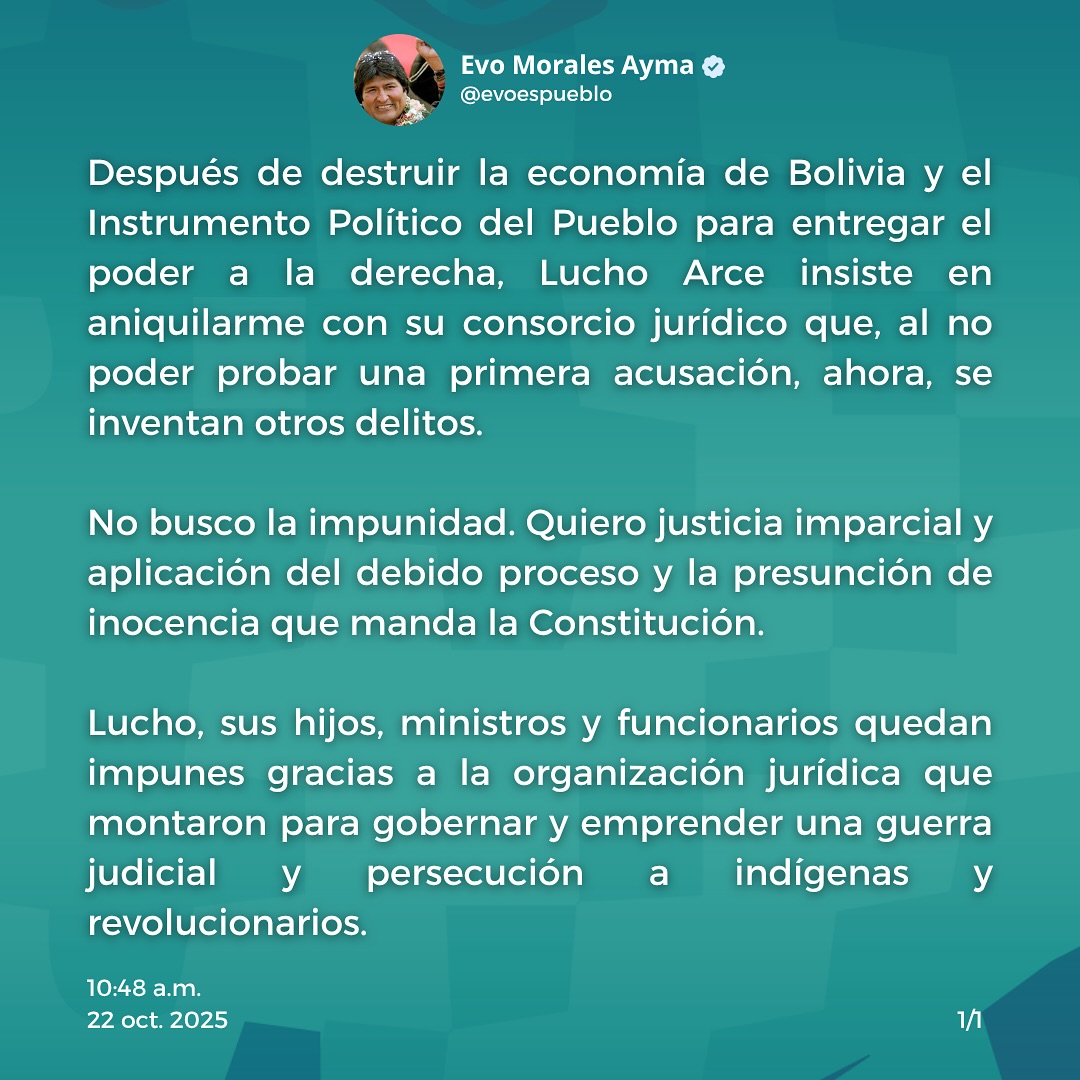 En su mensaje en redes, Morales aseguró que Arce, sus hijos, ministros y funcionarios “quedan impunes gracias a la organización jurídica que montaron para gobernar y emprender una guerra judicial y persecución a indígenas y revolucionarios”.