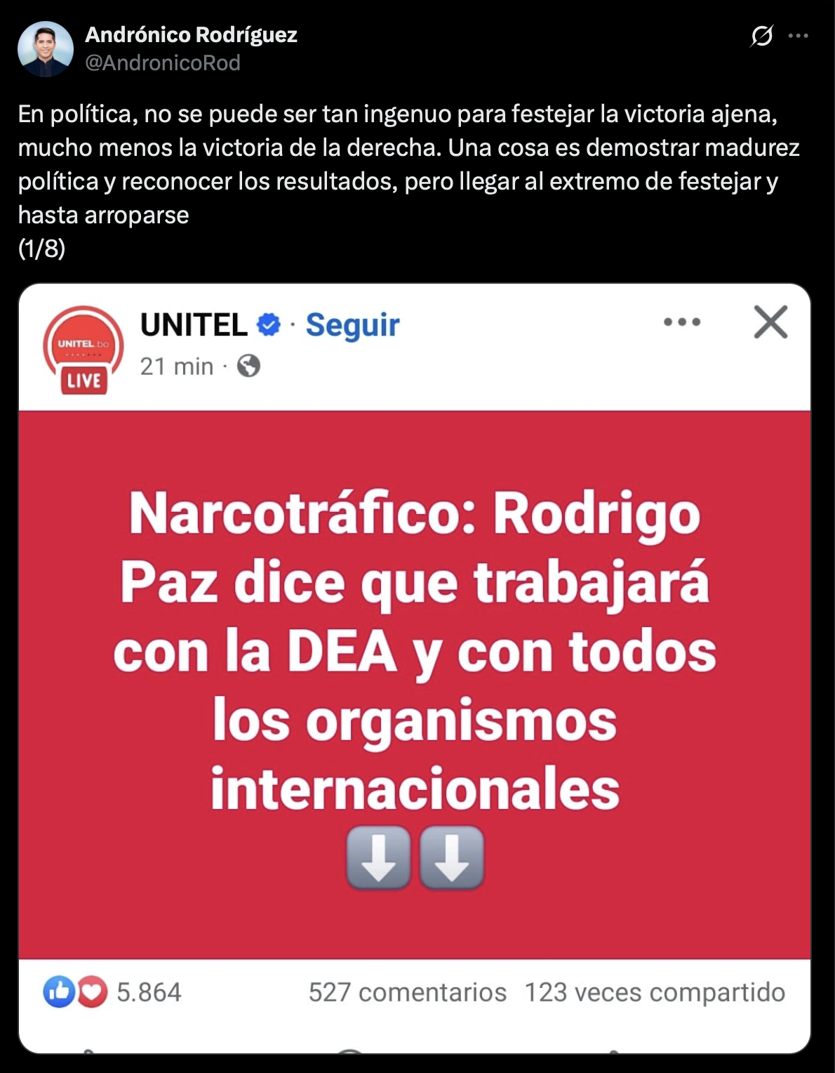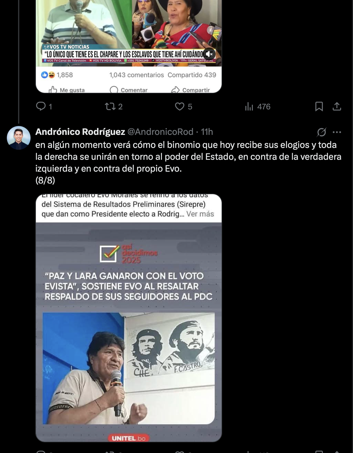 “Paz y Lara, ganaron con el voto evista, el voto de los indignados por la proscripción y exclusión electoral (…) El pueblo de los barrios populares y del área rural, como no tenían su candidato, no tuvo otra opción que votar por Paz y Lara. Pero no les da un cheque en blanco”, escribió Morales.