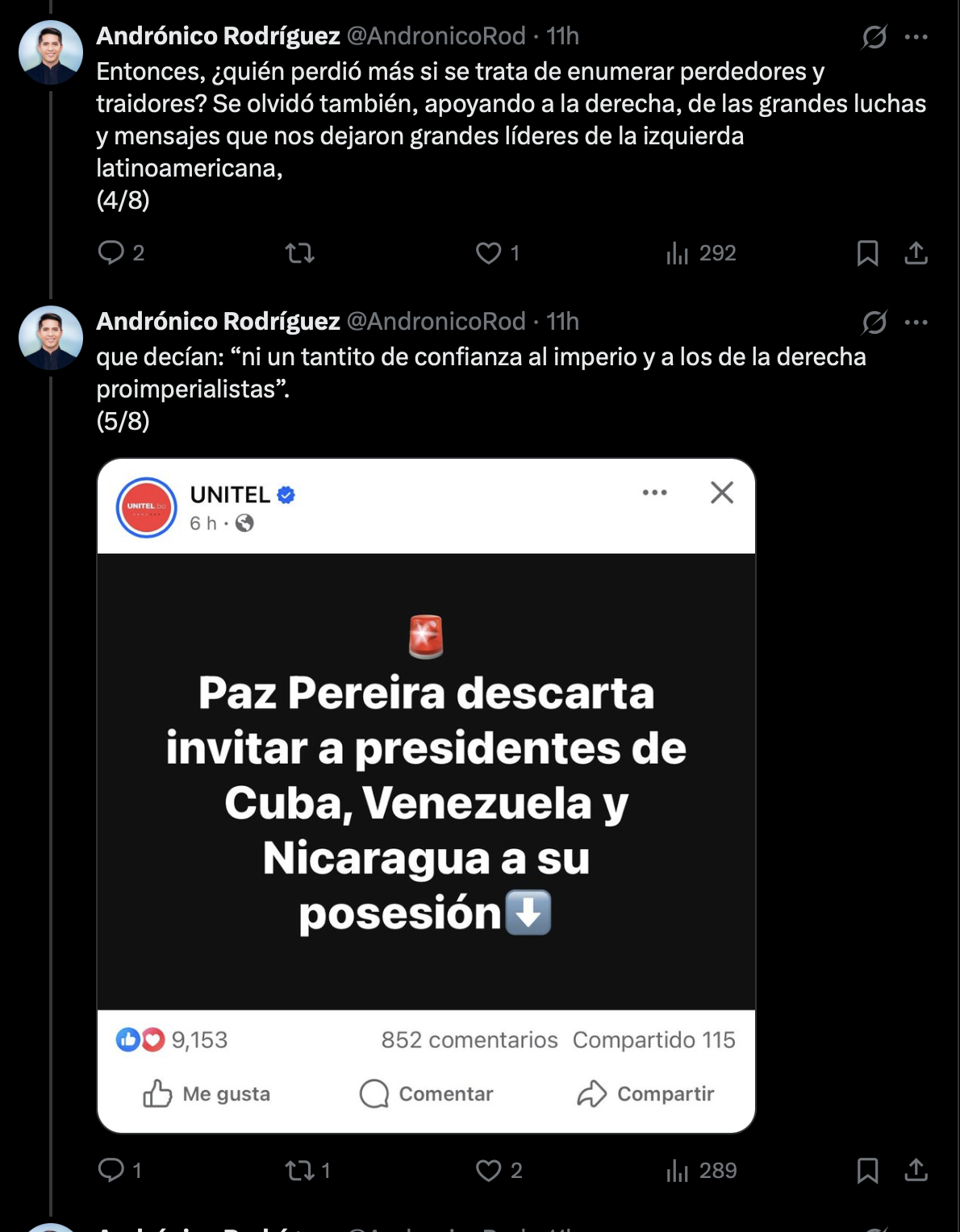 “En política, no se puede ser tan ingenuo para festejar la victoria ajena, mucho menos la victoria de la derecha. Una cosa es demostrar madurez política y reconocer los resultados, pero llegar al extremo de festejar y hasta arroparse y atribuirse la victoria de la derecha es mucha inmoralidad, irrespeto y traición a las bases”, escribió Rodríguez en su cuenta de X.