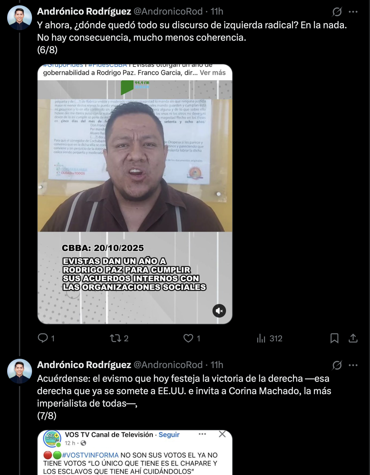 Rodríguez aseguró que el evismo que hoy celebra a la derecha verá cómo el binomio electo “se unirá (…) en contra de la verdadera izquierda” y también en contra del propio Morales.