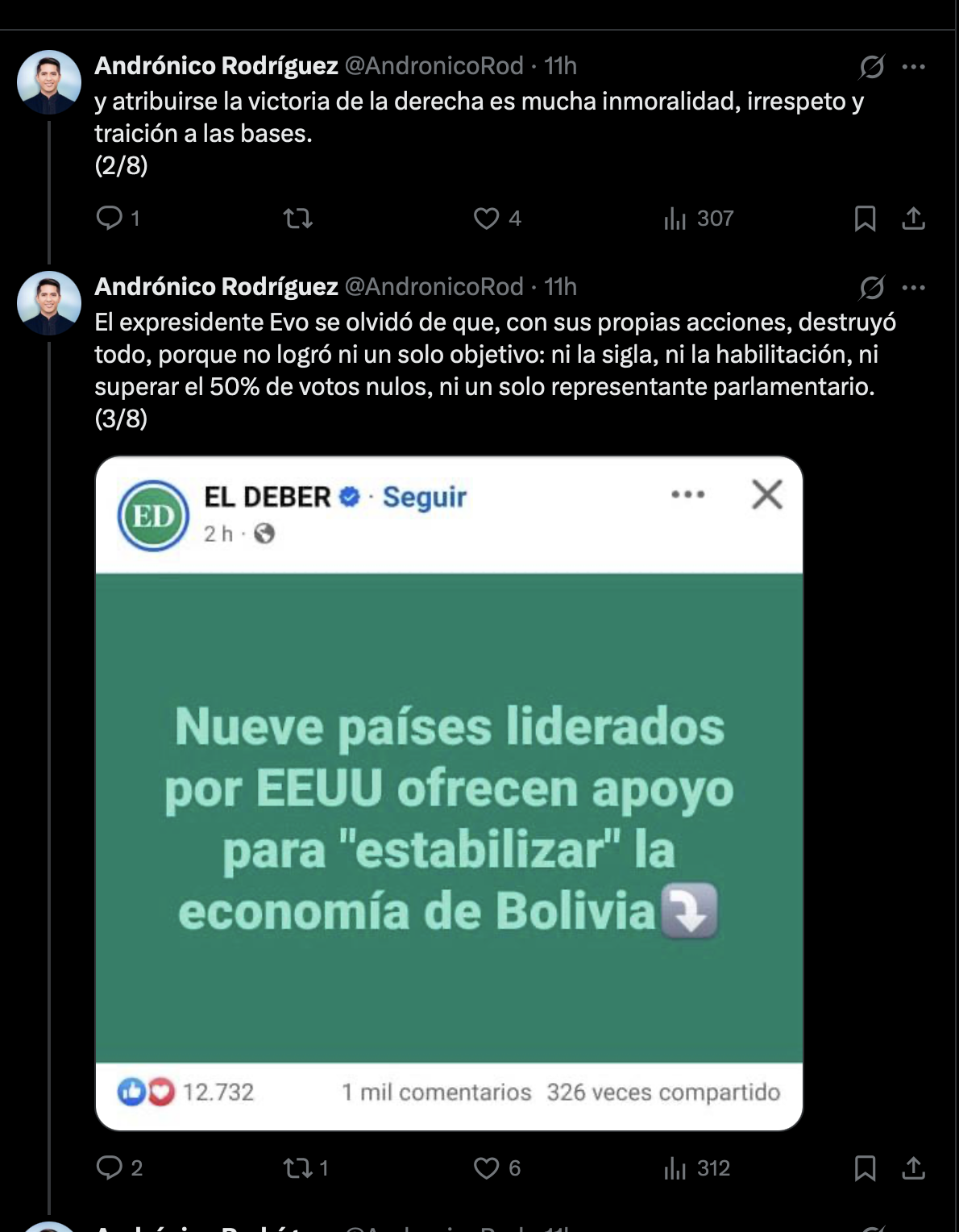 Rodríguez afirmó que Morales olvidó que fueron “sus propias acciones” las que “destruyeron todo”, ya que no logró ninguno de sus objetivos: recuperar la sigla del MAS, obtener su habilitación para participar en las elecciones, superar el 50% de votos nulos ni asegurar representación en la Asamblea Legislativa Plurinacional.