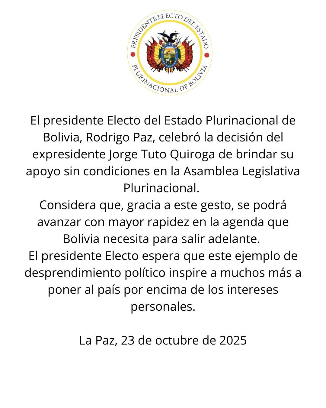 “El presidente Electo del Estado Plurinacional de Bolivia, Rodrigo Paz, celebró la decisión del expresidente Jorge Tuto Quiroga de brindar su apoyo sin condiciones en la Asamblea Legislativa Plurinacional”, señala el comunicado.