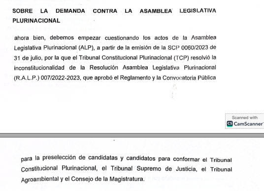 La acción contra la ALP se fundamenta en la aprobación de normas referidas a las elecciones judiciales de diciembre de 2024 y en la continuación del proceso de preselección de candidatos, pese a las determinaciones del TCP.