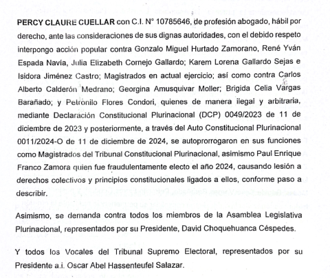 El recurso fue planteado por Percy Claure Cuellar contra los magistrados autoprorrogados Gonzalo Hurtado Zamorano, René Espada Navia, Julia Cornejo, Karem Gallardo Sejas e Isidora Jiménez Castro, además de otras altas autoridades del TCP.