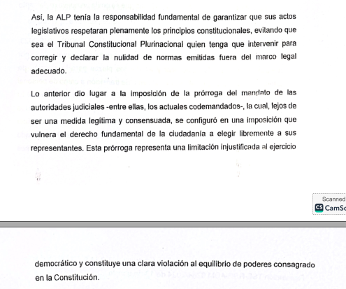 Claure solicita que se declare la vulneración de los derechos colectivos a la seguridad jurídica, la institucionalidad democrática, la independencia judicial y el control constitucional debido a la autoprórroga de los magistrados.