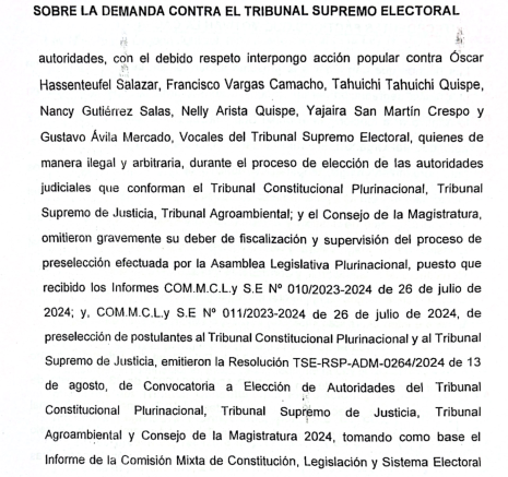 Además, se dirige contra todos los vocales del Tribunal Supremo Electoral (TSE), representados por el presidente interino del ente, Oscar Hassenteufel.