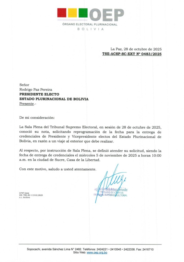 “Por instrucción de Sala Plena, se definió atender su solicitud, siendo la fecha de entrega de credenciales el miércoles 5 de noviembre de 2025 a horas 10:00 a.m. en la ciudad de Sucre, Casa de la Libertad”, dice un comunicado del TSE.