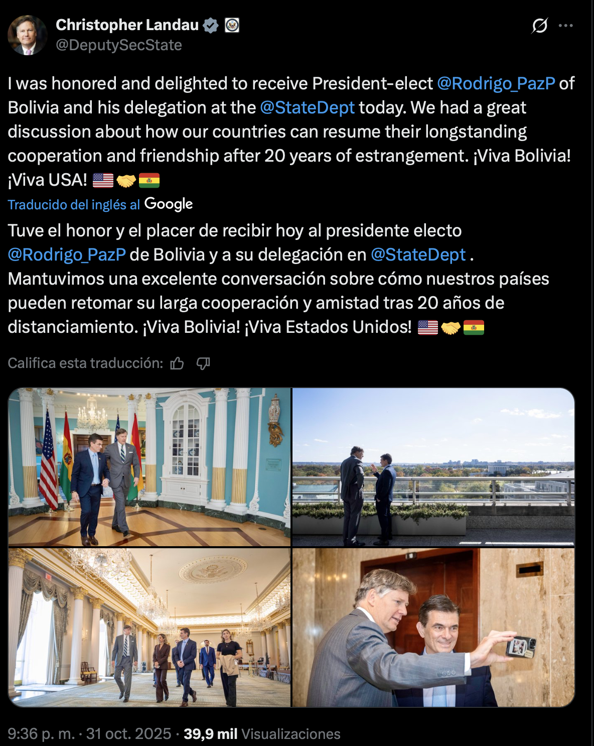“Tuve el honor y el placer de recibir hoy al presidente electo Rodrigo Paz de Bolivia y a su delegación en el Departamento de Estado. Mantuvimos una excelente conversación sobre cómo nuestros países pueden retomar su larga cooperación y amistad tras 20 años de distanciamiento. ¡Viva Bolivia! ¡Viva Estados Unidos!", escribió Landau en su cuenta de X.