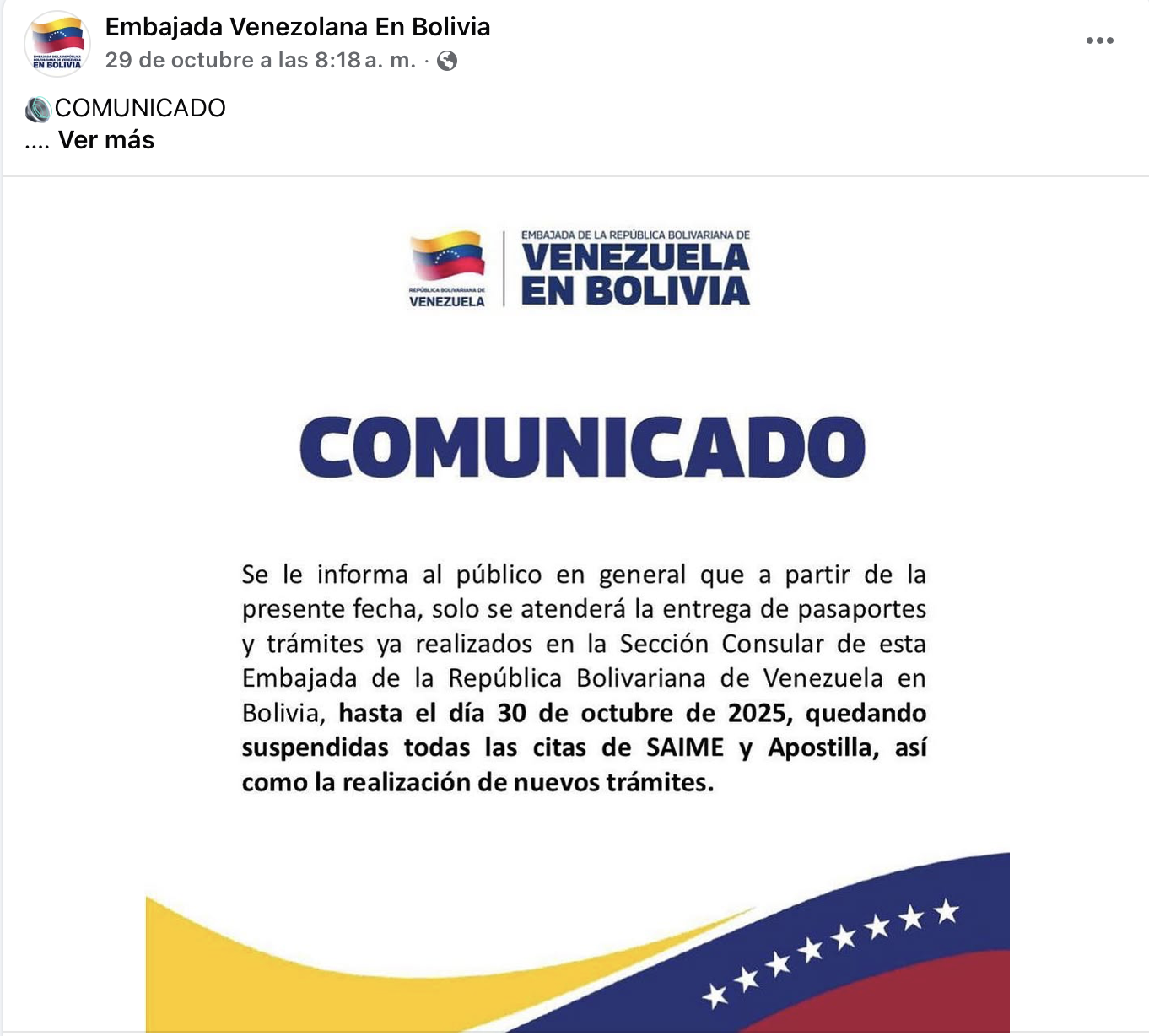 “Se le informa al público en general que a partir de la presente fecha, solo se atenderá la entrega de pasaportes y trámites ya realizados en la Sección Consular de esta Embajada de la República Bolivariana de Venezuela en Bolivia, hasta el día 30 de octubre de 2025, quedando suspendidas todas las citas de SAIME y Apostilla, así como la realización de nuevos trámites”, según un comunicado de la legación diplomática.