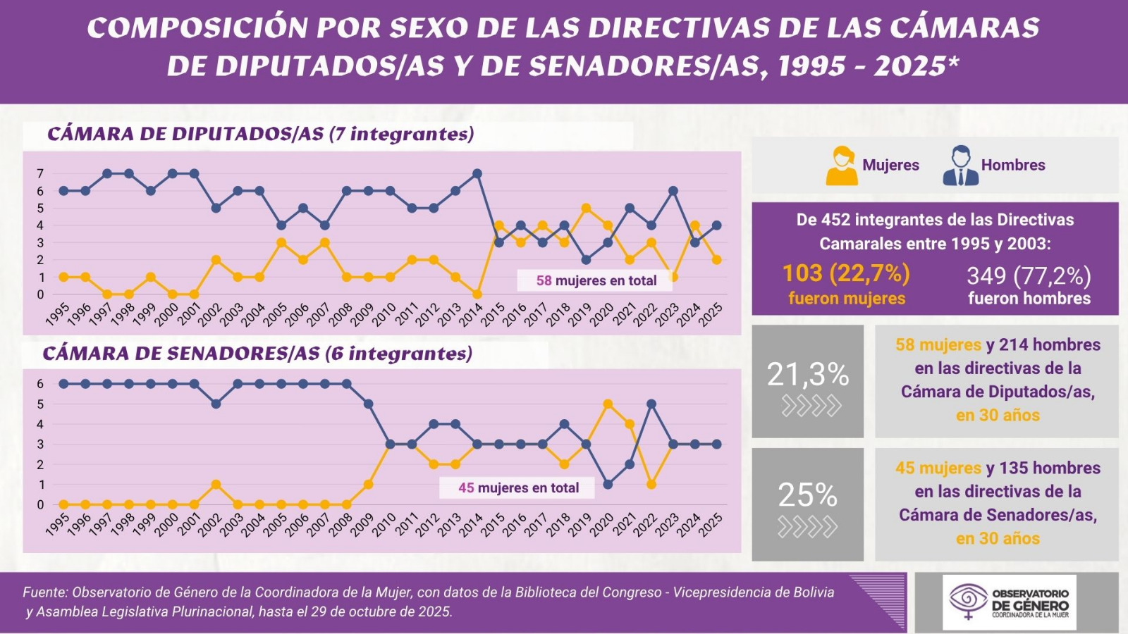 Una revisión hemerográfica y bibliográfica de la composición de las directivas camarales, del periodo 1995 - 2025 (hasta 30 de octubre), realizada por el Observatorio de Género de la Coordinadora de la Mujer, revela la persistencia de una brecha de género -en favor de los hombres-, a pesar de la creciente presencia de las mujeres en la política, fruto de un marco normativo favorable a la paridad y la lucha del movimiento de mujeres de Bolivia.