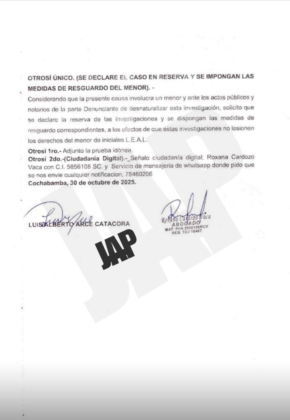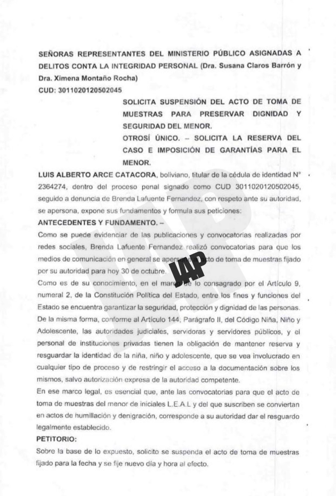 “Es esencial que, ante las convocatorias para que el acto de toma de muestras del menor de iniciales L.E.A.L y del que suscriben se conviertan en actos de humillación y denigración, corresponde a su autoridad dar el resguardo legalmente establecido”, señala la solicitud que remitió Arce al Ministerio Público y que fue publicada por el periodista Jhon Arandia en su fanpage.