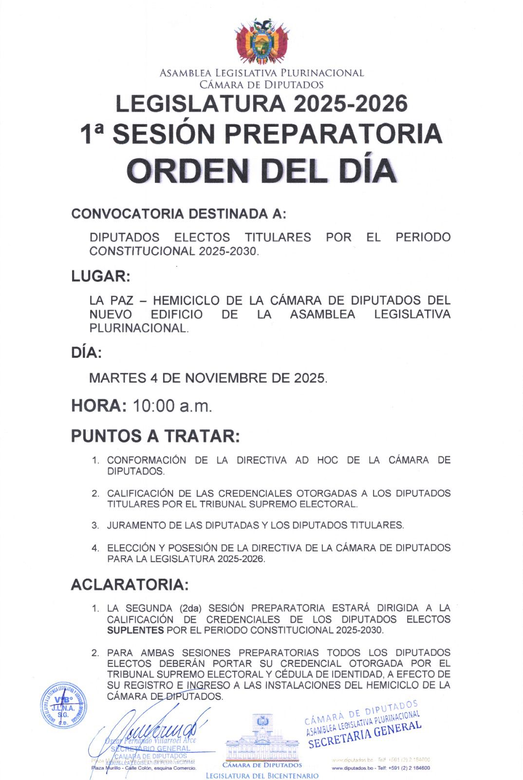 La convocatoria fue emitida la semana pasada y lleva la firma del secretario general de la Cámara de Diputados, Oscar Villarroel Arce.