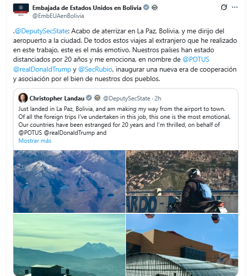 “Acabo de aterrizar en La Paz, Bolivia, y me dirijo del aeropuerto a la ciudad. De todos estos viajes al extranjero que he realizado en este trabajo, este es el más emotivo”, escribió Landau en su cuenta de X.