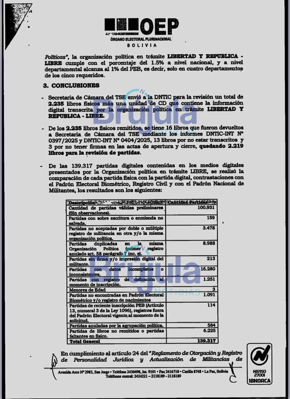 El informe técnico señala que de 139.317 partidas revisadas, 39.000 fueron anuladas por diversas irregularidades. Se detectó además: doble o múltiple militancia, partidas con sobreescrituras, registros duplicados, firmas inexistentes, datos incompletos o inconsistentes. Según el documento oficial del Órgano Electoral Plurinacional, de los 2.235 libros físicos remitidos por Libre, 16 fueron devueltos por falta de transcripción o ausencia de firmas en las actas de apertura y cierre, quedando 2.219 libros sometidos a revisión detallada.