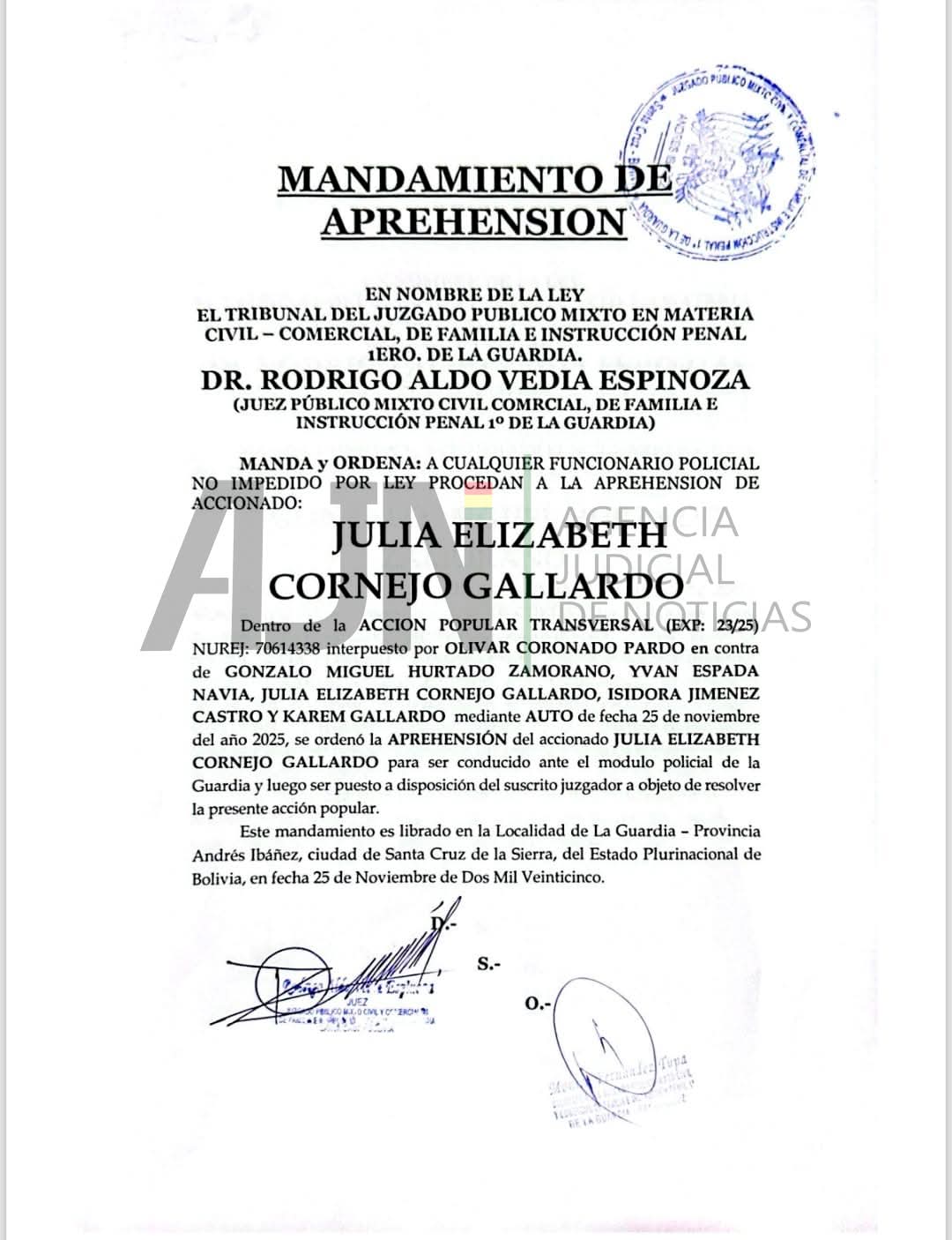 Según informa El Deber, el juez Rodrigo Vedia Espinoza, del Juzgado de Instrucción primero de La Guardia, emitió cuatro órdenes de aprehensión contra Gonzalo Miguel Hurtado Zamorano, Rene Yvan Espada Navia, Julia Elizabeth Cornejo Gallardo y Karen Gallardo. La determinación incluye la instructiva de “ser conducidos ante el módulo policial de La Guardia y luego ser puesto a disposición del suscrito juzgador a objeto de resolver la presente acción popular”.