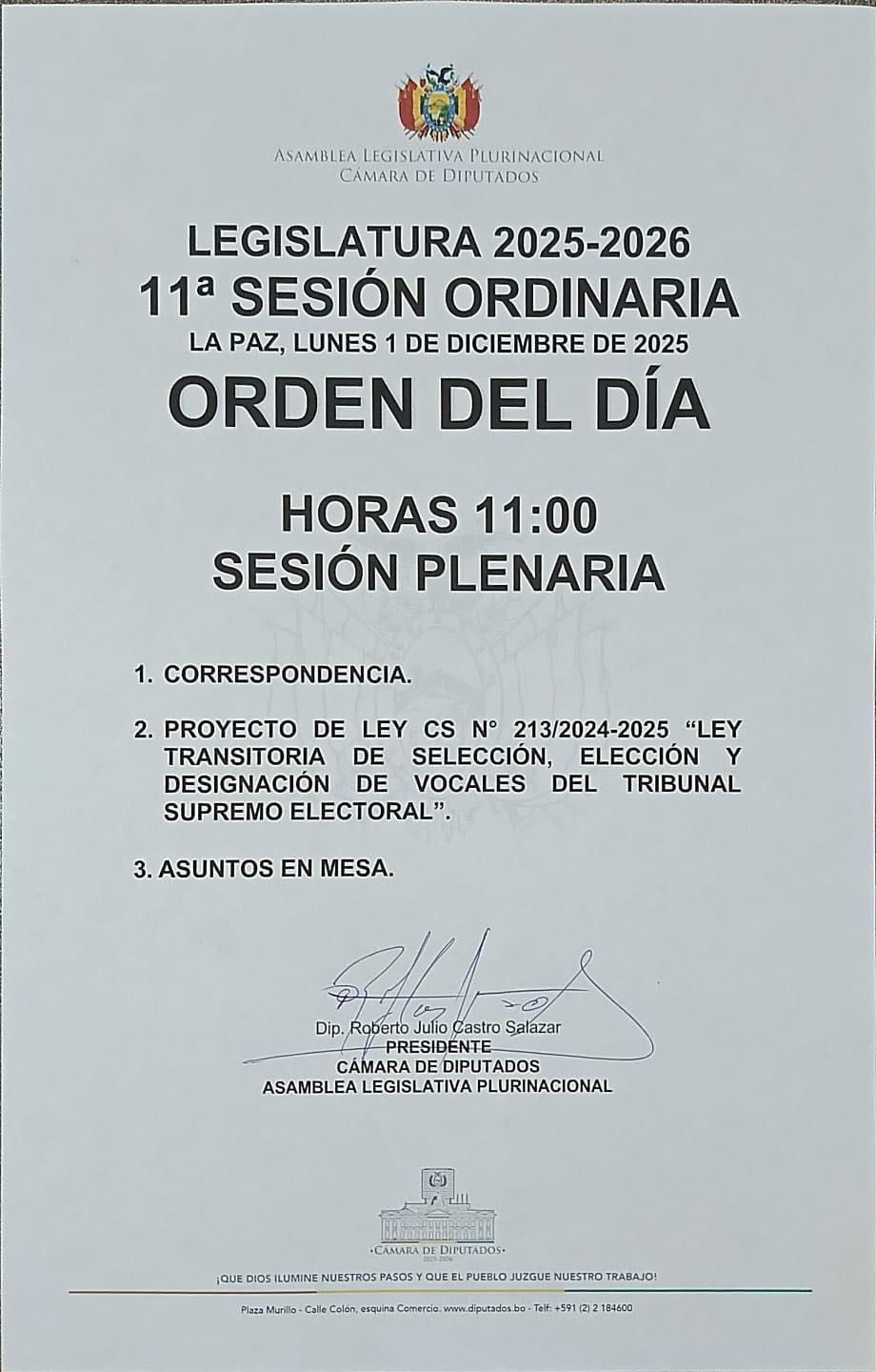 La Cámara de Diputados convocó a su 11ª Sesión Ordinaria de la Legislatura 2025–2026 para este lunes a las 11:00, con el fin de tratar el proyecto de “Ley Transitoria de Selección, Elección y Designación de Vocales del Tribunal Supremo Electoral”.