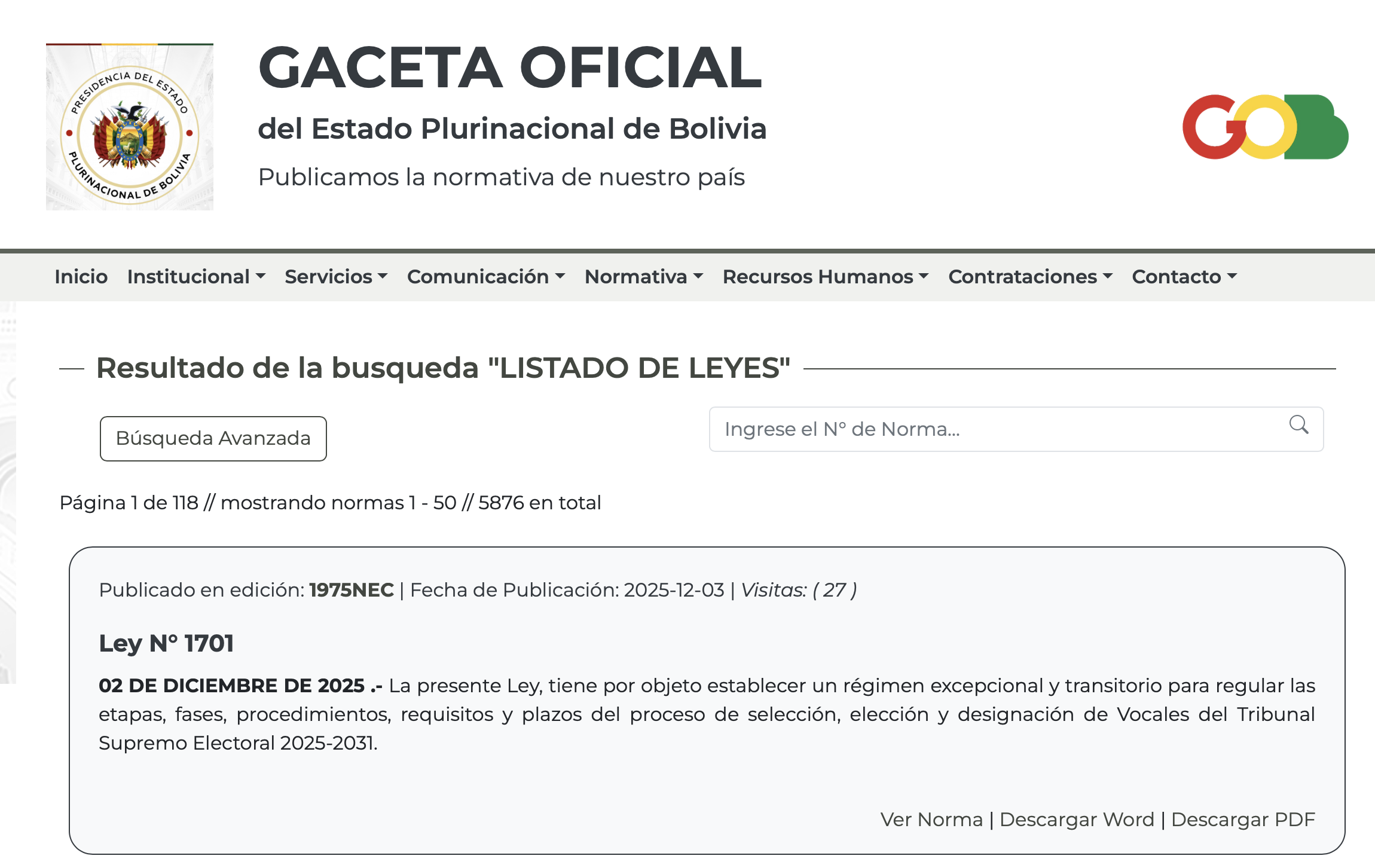 El presidente, Rodrigo Paz, promulgó este miércoles la Ley Transitoria de Selección, Elección y Designación de Vocales del Tribunal Supremo Electoral (TSE). La norma ya se encuentra publicada en la Gaceta Oficial.