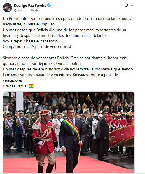 El presidente, Rodrigo Paz, publicó este lunes un mensaje en sus redes sociales con motivo de cumplirse un mes de su posesión. Afirmó que existen avances y que el país camina “a paso de vencedores”.
