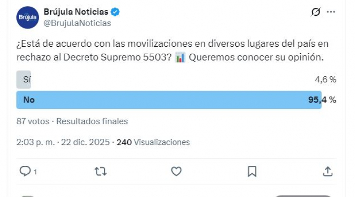 La mayoría de los ciudadanos consultados a través de las redes sociales de Brújula Digital expresó su desacuerdo con las movilizaciones que se registran en distintos puntos del país en rechazo al Decreto Supremo 5503, según los resultados de un reciente sondeo de opinión.