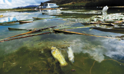 Peces muertos en medio de agua sucia y contaminada del Titicaca. Foto: Vida Comunitaria