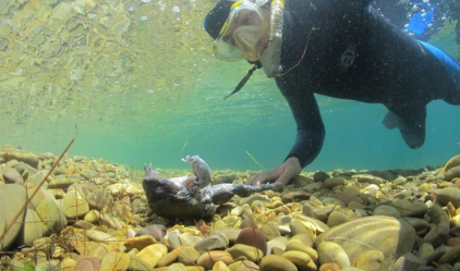 Rana gigante muerta al fondo del lago. La especie está en peligro de extinción. Foto: Arturo Muñoz