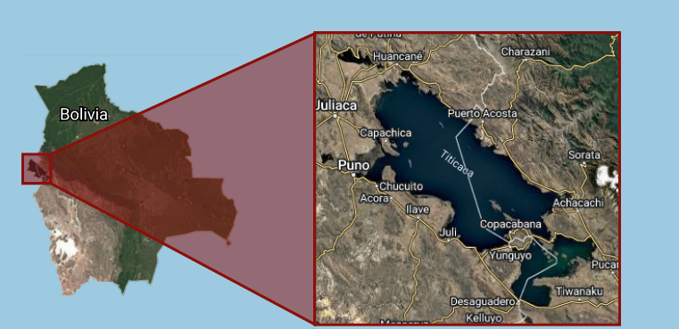 Mapa localizador del lago Titicaca, compartido por Bolivia y Perú.