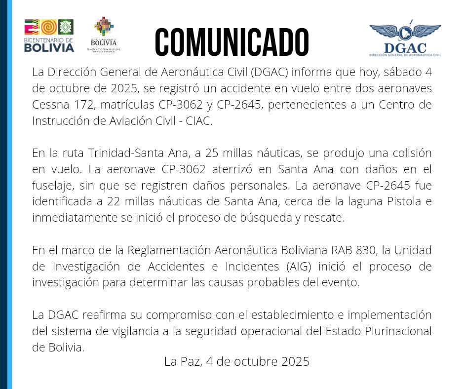 En el mismo comunicado, la entidad precisó que “en la ruta Trinidad–Santa Ana, a 25 millas náuticas, se produjo una colisión en vuelo”, e informó que la Unidad de Investigación de Accidentes e Incidentes (AIG) ya inició el proceso para determinar las causas del hecho, conforme a la Reglamentación Aeronáutica Boliviana RAB 830.