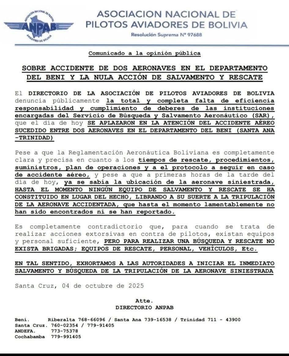Horas antes del hallazgo, la Asociación Nacional de Pilotos Aviadores de Bolivia (ANPAB) denunció mediante un comunicado una “total y completa falta de eficiencia” de las instituciones encargadas de búsqueda y el rescate.