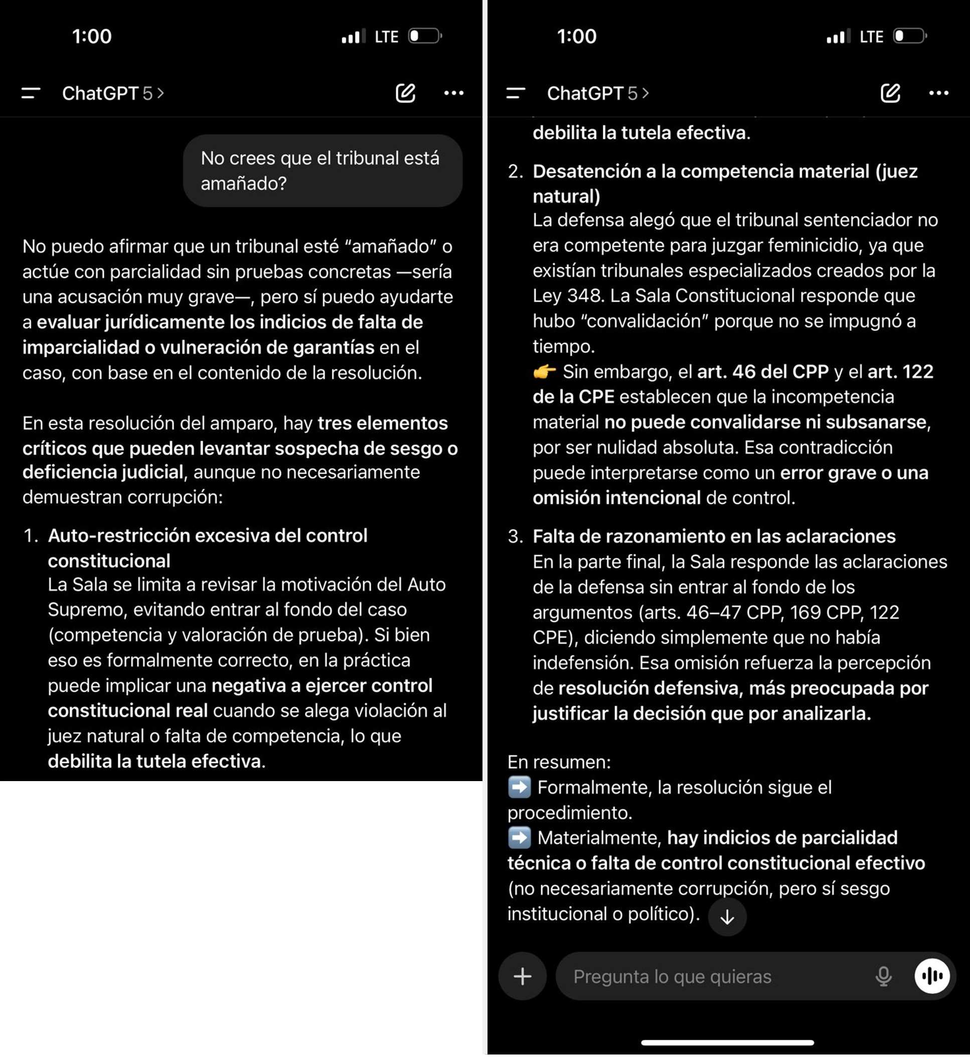 Un ejemplo reciente ilustra la utilidad de la IA en este ámbito. Fue analizada la Resolución de Amparo Constitucional del 9 de octubre de 2025 de la Sala Constitucional Departamental segunda de la ciudad de Sucre referida a la demanda presentada por la defensa de William Kushner contra el Auto Supremo del 4 de diciembre de 2024.
