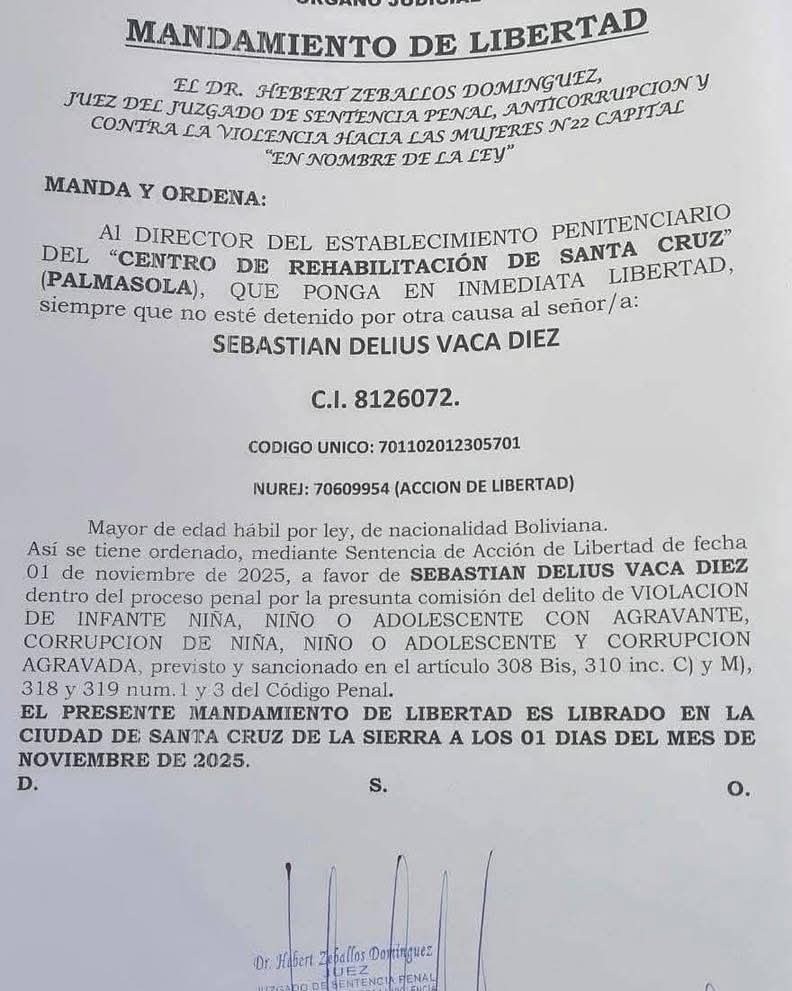 Sin embargo, al cumplirse el plazo de su detención preventiva, el juez Zeballos Domínguez determinó su liberación, decisión que generó críticas entre quienes consideran que se trata de una medida prematura, tomando en cuenta los antecedentes del acusado, quien ya había evadido la justicia.
