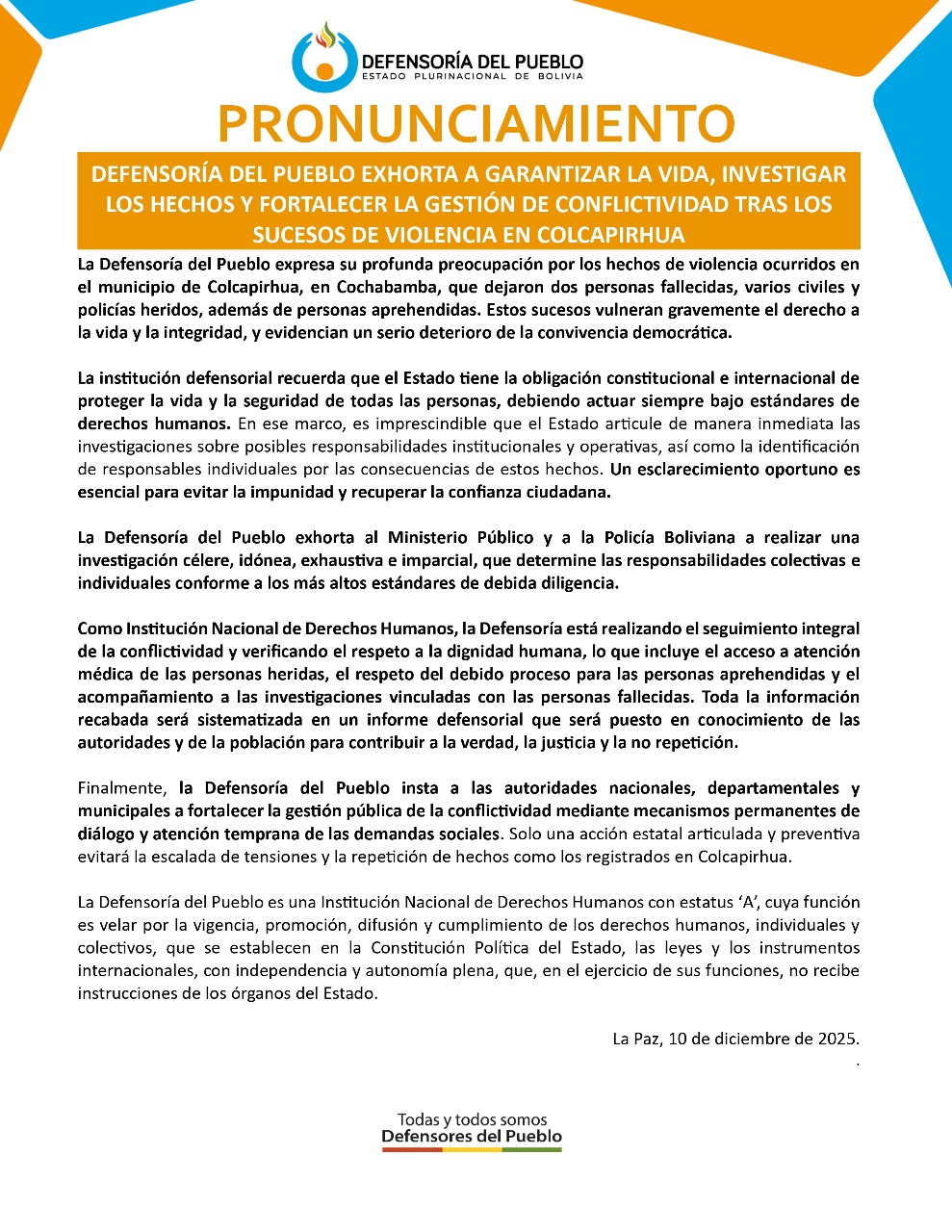 Ante las dos muertes registradas el lunes en un enfrentamiento durante un desbloqueo en el botadero de Colcapirhua, en Cotapachi, la Defensoría del Pueblo recordó que el Estado tiene la obligación de proteger la vida y pidió a la Fiscalía y a la Policía impulsar una investigación rápida, exhaustiva e imparcial.