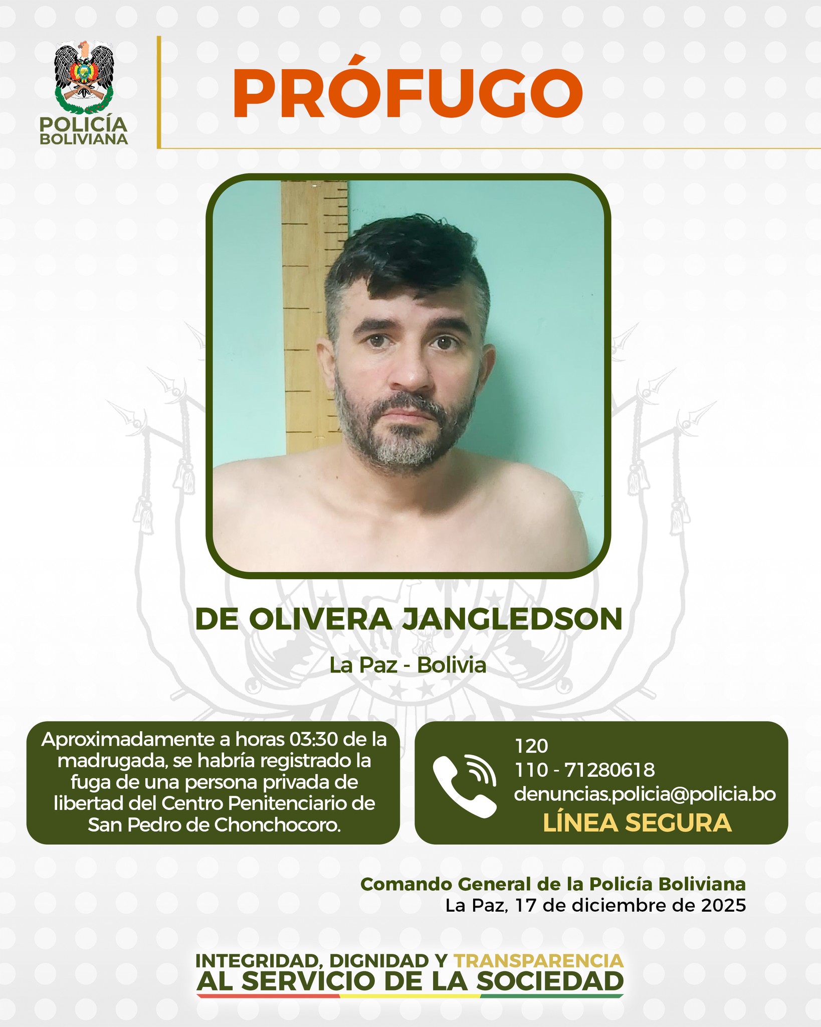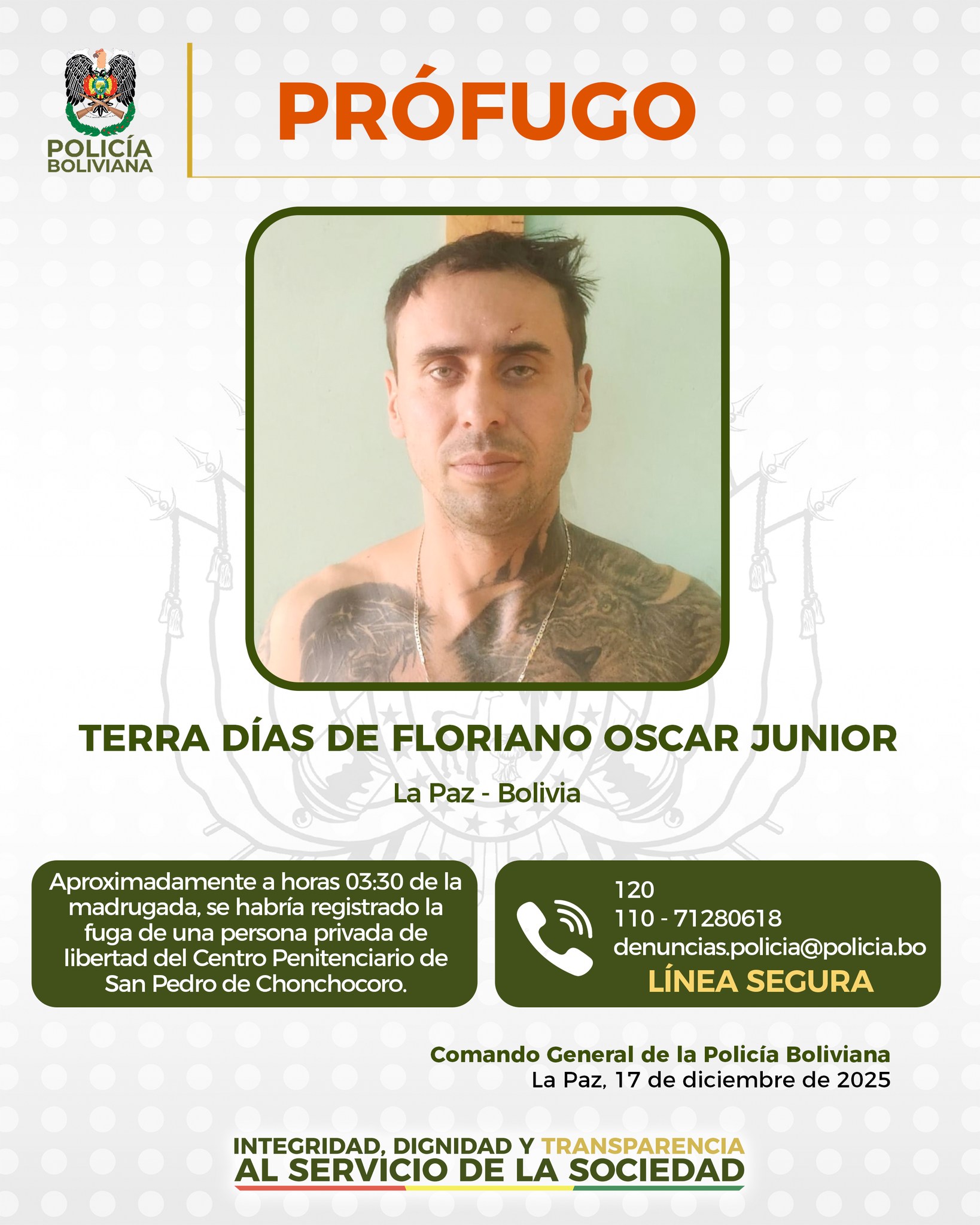 Según un comunicado de la Policía Boliviana publicado en su página oficial de Facebook, “aproximadamente a horas 03:30 de la madrugada se registró la fuga de una persona privada de libertad del Centro Penitenciario de San Pedro de Chonchocoro”.