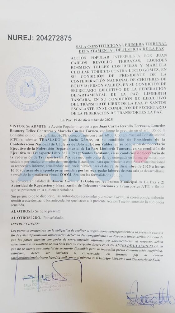 Además, fueron convocados en calidad de amicus curiae (proveedores de información y argumentos) el Gobierno Autónomo Municipal de La Paz (GAMLP) y la Autoridad de Regulación y Fiscalización de Telecomunicaciones y Transporte (ATT). “Sin perjuicio de lo dispuesto, las autoridades accionadas y amicus curiae, si corresponde, deberán remitir a este despacho los antecedentes que hacen a la presente Acción Tutelar, antes de la audiencia señalada”, añade el documento de la Sala Constitucional al que tuvo acceso ANF.